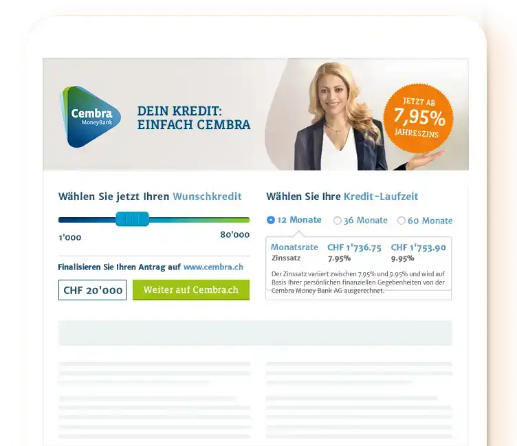 komplette fallstudie>>Unsere maßgeschneiderten und voll interaktiven Rich-Media-Banner ermöglichen es den Nutzern, einen Kredit ihrer Wahl in nur zwei einfachen Schritten zu berechnen. Gleichzeitig zeigen sie Cembra’s Engagement für exzellenten Kundenservice und lenken den Traffic auf ihre flexiblen Kreditdienstleistungen.